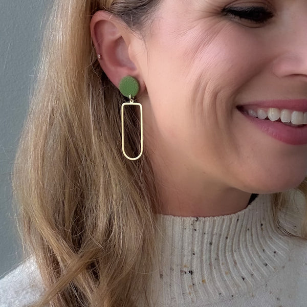 The Julia earrings include a small circle (top) made of polymer clay, in textured olive green, and a uniquely shaped brass component (bottom). The pieces are connected with a gold jump ring.