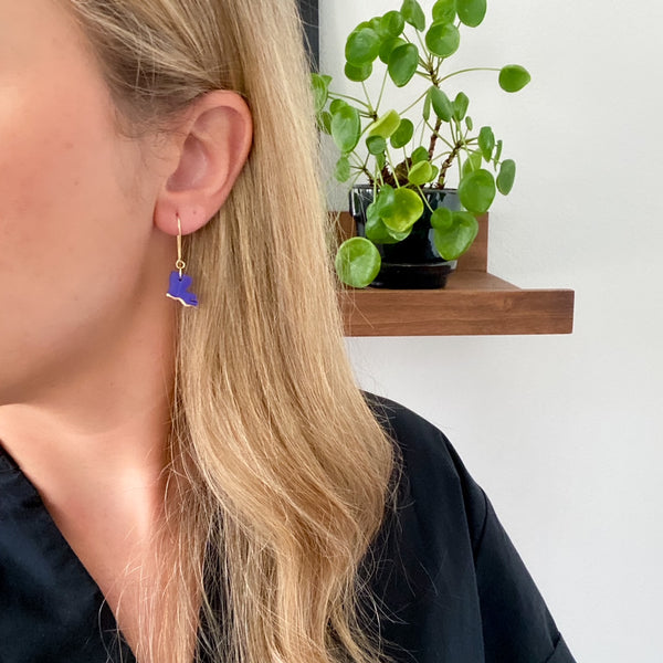 Louisiana dangle earrings, slow-made of polymer clay in purple, with gold bottom trim