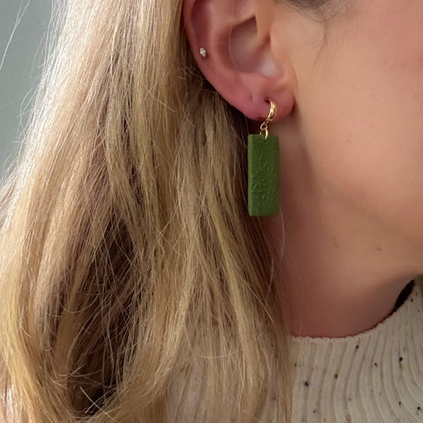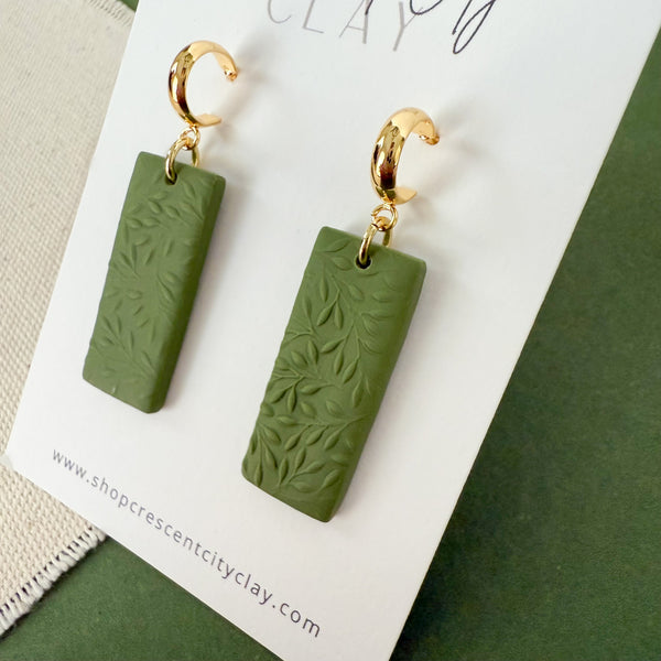Our Rita Earrings with Leaf Texture are made of polymer clay in our olive green colorway. The pieces are connected with a gold jump ring.